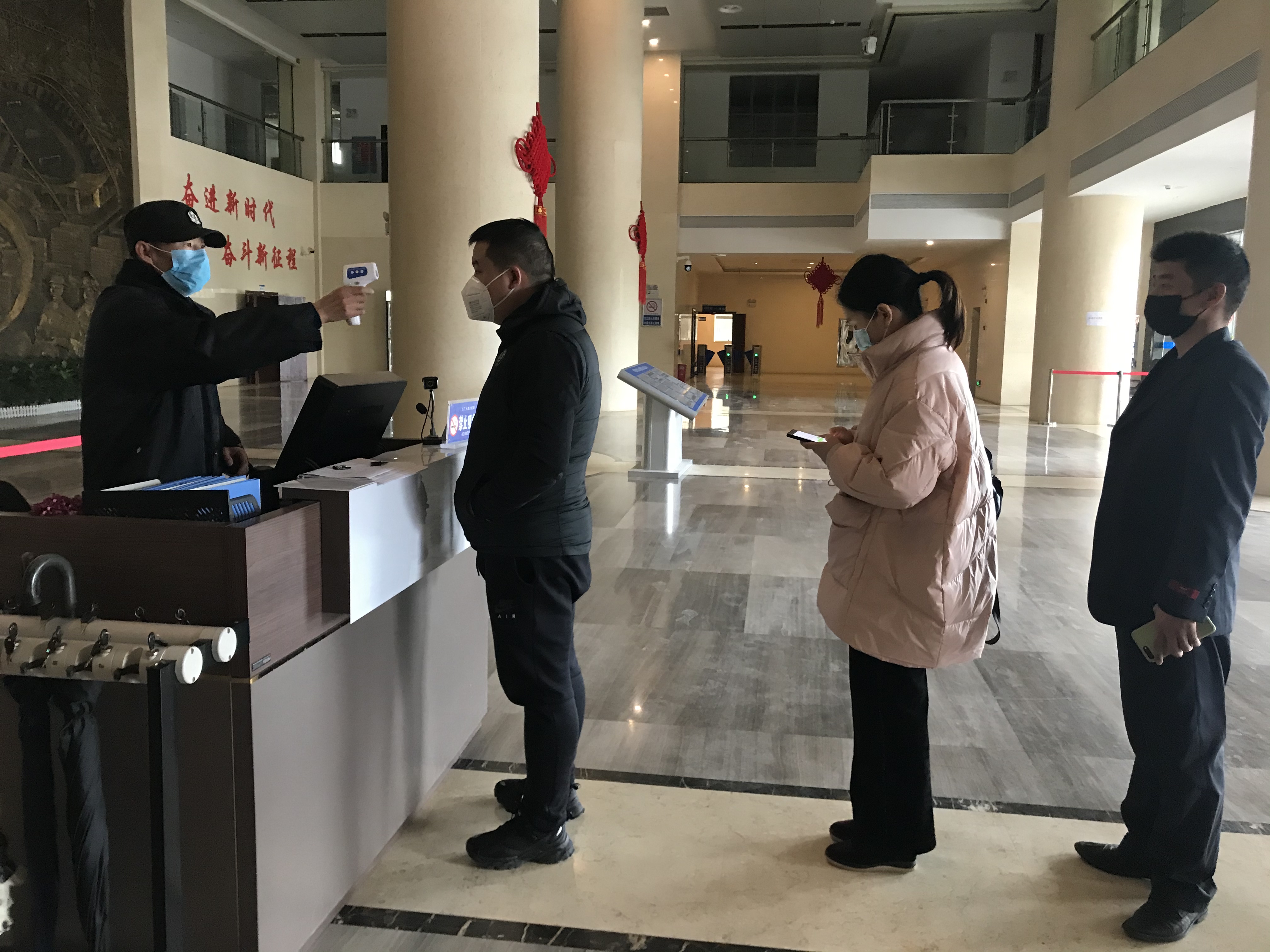 值班人員對(duì)智慧大廈進(jìn)出人員進(jìn)行體溫檢測(cè)