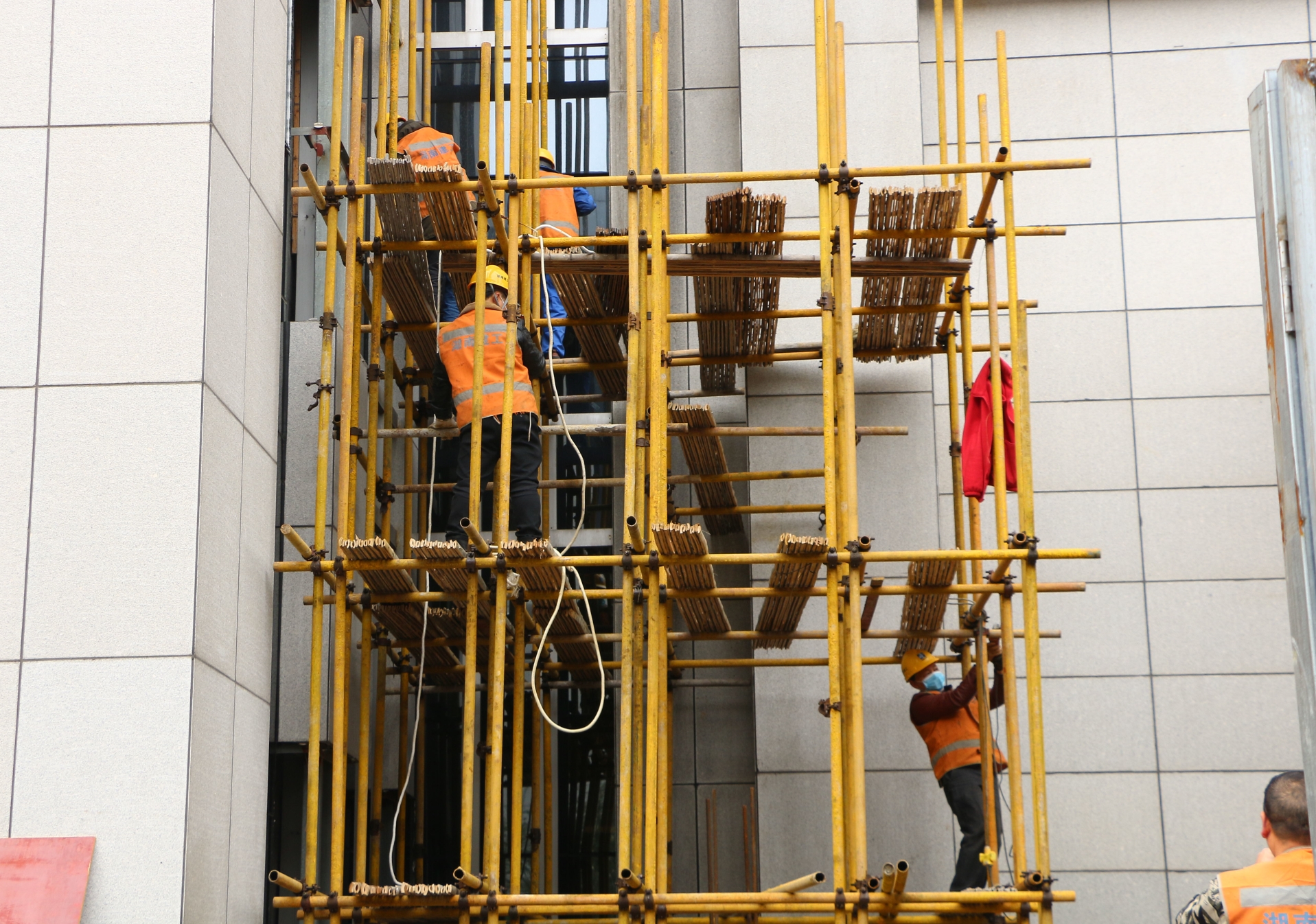 市民服務(wù)中心電梯項目施工人員正在搭建腳手架