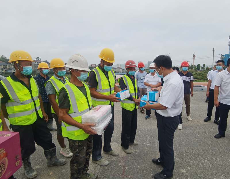 領(lǐng)導(dǎo)班子成員將慰問品和防疫物資遞交給施工人員
