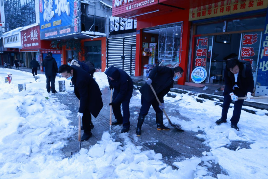 工作人員們發(fā)揚(yáng)不怕苦、不怕累、不畏嚴(yán)寒的精神,分工合作,鏟的鏟,掃的掃,干得熱火朝天,很快厚厚的積雪就被大家清理干凈了。大家在除雪的同時(shí),還不斷提醒路人“小心地滑,注意安全”。