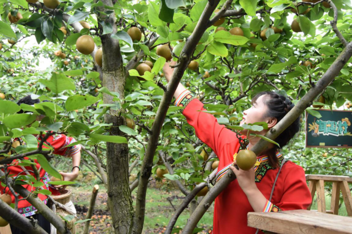 2019年8月22日,在靖州渠陽(yáng)鎮(zhèn)林源村金秋梨基地的淘寶直播現(xiàn)場(chǎng),身穿苗服的小阿妹現(xiàn)場(chǎng)摘梨、裝箱打包。