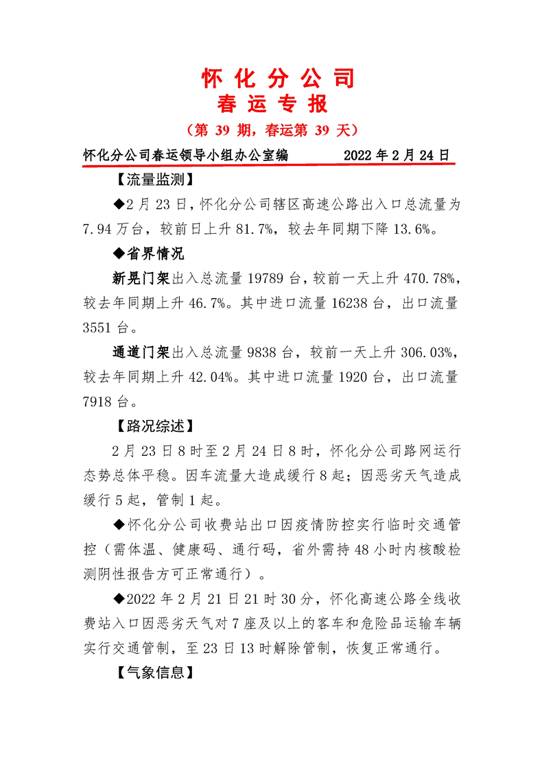 2022年高速懷化分公司第39期春運(yùn)專報(bào)