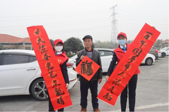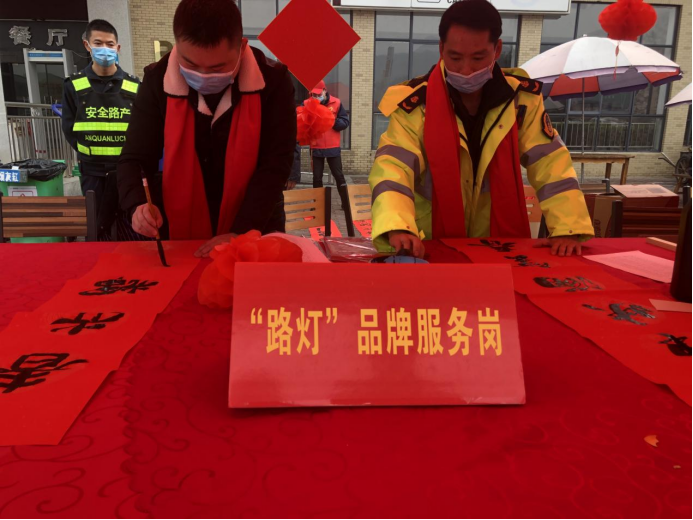 冬日暖陽(yáng),春節(jié)腳步臨近。1月11日,在G65包茂高速公路洪江服務(wù)區(qū)內(nèi),繁忙而有序。在服務(wù)區(qū)一側(cè),懷化分公司的“路燈”志愿者正在現(xiàn)場(chǎng)揮毫潑墨、寫(xiě)福送春聯(lián),洋溢著濃濃的喜慶氛圍。活動(dòng)現(xiàn)場(chǎng)引來(lái)許多司乘朋友圍觀,有的直接挑選已經(jīng)寫(xiě)好的“成品”,有的則根據(jù)自己的需要邀請(qǐng)志愿者為他們“量身定制”。一幅幅紅春聯(lián)和金燦燦的“?!弊譂M(mǎn)載著新春祝福,傳遞著濃濃溫情。