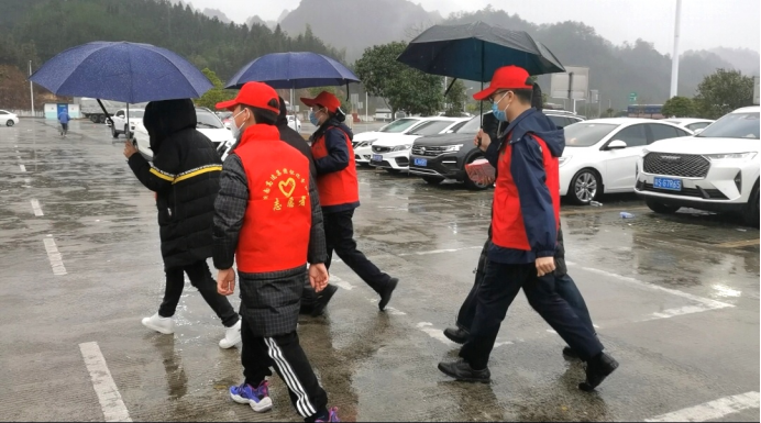 無獨有偶,在通道服務(wù)區(qū),一把把“暖心傘”撐起了這風(fēng)雪旅途上的“晴天”。這次雨雪來得突然,很多司乘車上都沒有帶雨具,在停車區(qū)下車后只能淋雨前往綜合區(qū)?!奥窡簟敝驹刚吡私馇闆r后,主動為每一位司乘撐起暖心傘,在停車區(qū)和綜合區(qū)之間“迎來送往”。 同時,“路燈”志愿者還為司乘提供指引路線、指揮車輛、發(fā)放健康包、送姜茶等服務(wù),暖心的服務(wù)得到司乘的一致好評。