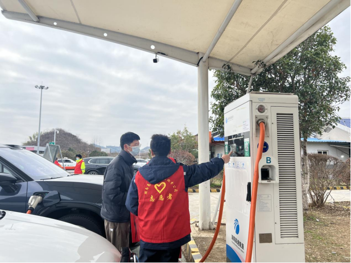 大年初三,外出旅游獲探親訪友的車輛越來(lái)越多,考慮到許多司乘人員對(duì)充電樁使用生疏,為更好服務(wù)司乘朋友,縮短排隊(duì)充電時(shí)間,新晃片區(qū)管理所“路燈”志愿者們一早來(lái)到新晃服務(wù)區(qū),在電動(dòng)車充電樁處設(shè)置服務(wù)臺(tái),對(duì)前來(lái)充電的司乘人員進(jìn)行教學(xué)示范,保障其快速充電,并送上新年祝福。
