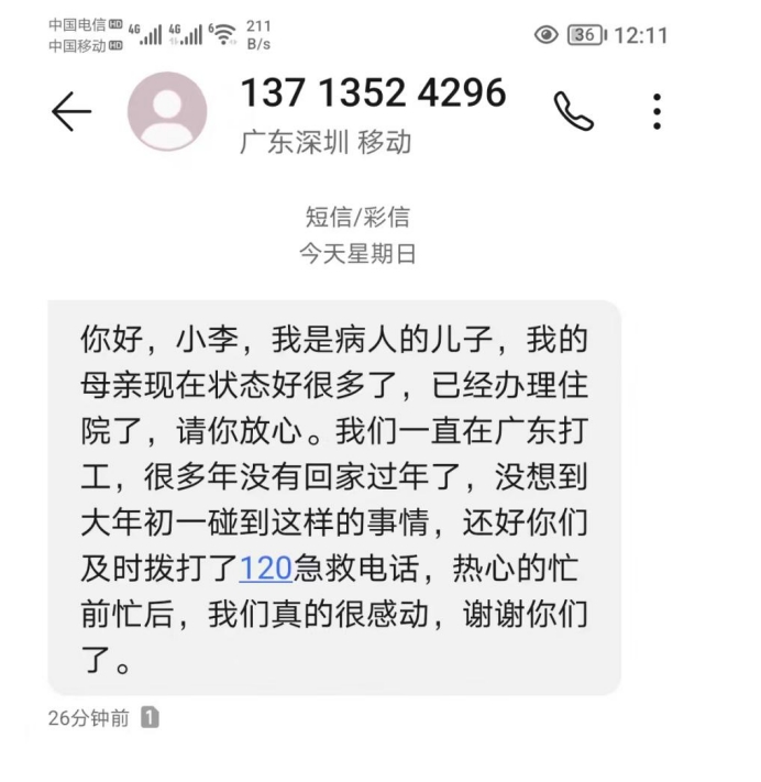 待老人各項(xiàng)體征平穩(wěn)后,收費(fèi)班長(zhǎng)李高強(qiáng)收到了一條感謝短信,對(duì)收費(fèi)站的暖心幫助表示感謝。